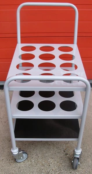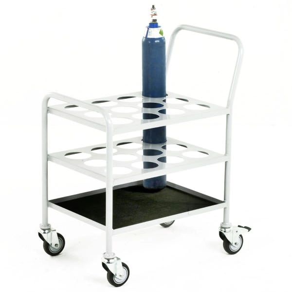 Small Cylinder Trolley that has been designed to safely transport 12 medical Oxygen gas cylinders. The lower lever is covered with a rubber cushioning to prevent slipping. Mounted on 4 swivel castors (2 braked) with non-marking wheels and roller bearings.